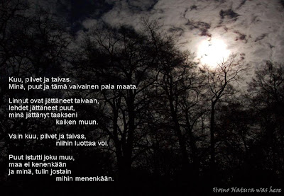 Maan pinnaltakin voi nähdä paljon. Voi nähdä taivaan ja tähdet, voi nähdä yli lentävät linnut ja pilvet. Tähtien määrä on muuttumaton, lintujen määrä muuttuu olosuhteiden mukaan. Joskus kun menen johonkin paikkaan, jossa ei ole lintuja lainkaan, paikka tuntuu aavemaisen autiolta ja tyhjältä. Ehkä eräänä päivänä taivaalla ei ole enää lintuja. Se on merkki jostain pysyvästä ja lopullisesta muutoksesta. Pilvet ovat joskus puhtaanvalkoisia, joskus harmaita ja mustia. Kun mustia pilviä nousee taivaalle, se on huono merkki. Silloin toivottavasti tulee myrsky, sillä jos ei tule, se voi tarkoittaa jotain todella pahaa ja lopullista. Myrkkypilvet voivat olla minkä värisiä vaan. Ne voivat olla punaisia, sinisiä, mustia tai vain tavallisen harmaita. Happosateen tunnistaa vasta kun se valuu päällesi. Kun puiden lehdet putoavat ja liukenevat maahan. Kun vihreä niitty palaa karrelle pisaroiden vaikutuksesta. Todennäköisesti emme näe tätä näkyä, sillä happi on loppunut jo sitä ennen ja me olemme tukehtuneet. Todennäköisesti emme edes tukehdu hapen puutteeseen, sillä ruoka loppuu ensin. Ehkä emme kuole edes nälkään, sillä puhdas vesi loppuu sitä ennen. Kuolemmeko janoon, emme varmaan sitäkään, sillä jotain muuta varmasti tapahtuu sitä ennen.